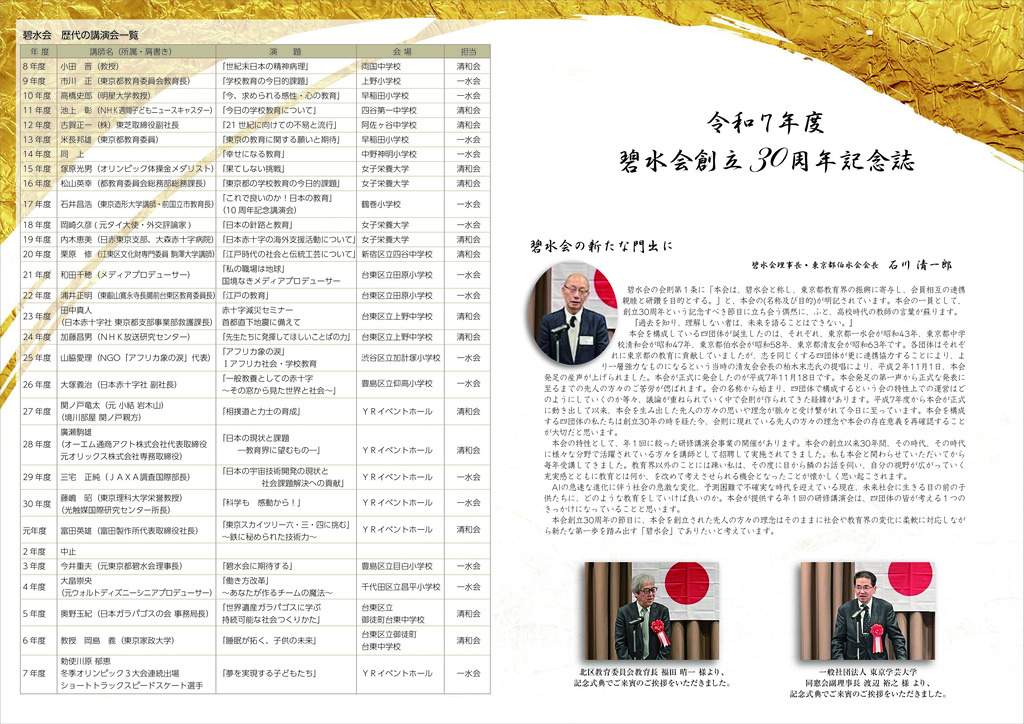 東京都一水会は、「清き流れの一つの水」の理念のもとに結成されました。 次代を担う子どもたちの健やかでたくましい成長と創意あふれる学校経営を目指して研修を企画し、会員相互の高め合いを目指しています。